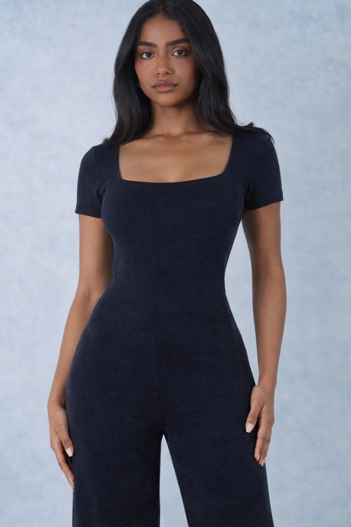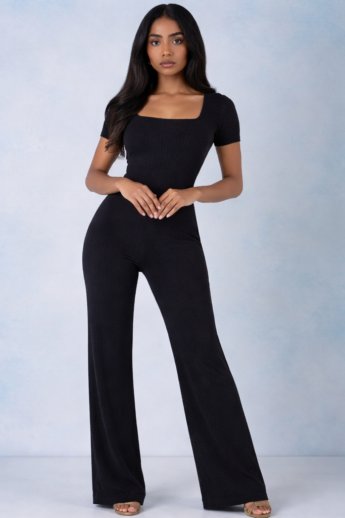 Macacão Pantalona Longo Decote Quadrado Manga Curta